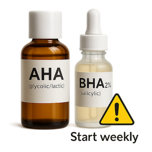 La exfoliación bien hecha aporta luminosidad inmediata y textura más fina. Los AHA (glicólico/láctico) corrigen la opacidad; el BHA (salicílico) mantiene los poros limpios. Empieza 1 vez/semana y sube a 2–3× si lo toleras. Evita mezclar ácidos potentes y retinoides la misma noche al inicio y detén si hay enrojecimiento o escozor.
