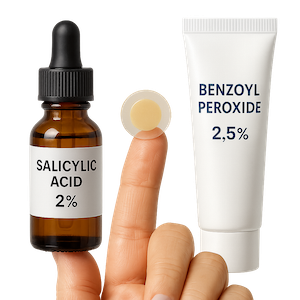 Exprimir favorece cicatrices y manchas que envejecen el aspecto. Trata de forma puntual: ácido salicílico para desobstruir y bajar la inflamación o peróxido de benzoilo para combatir bacterias. Los parches hidrocoloides evitan manipular y aceleran la recuperación. Mantén el resto de la rutina calmante para evitar resequedad.
