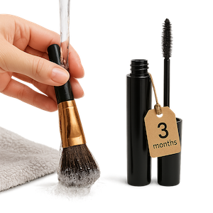 Las herramientas sucias diseminan microbios que causan brotes e irritación—opacan la piel. Lava las brochas cada 7–10 días con jabón suave, enjuaga bien y sécalas con las cerdas hacia abajo. Cambia la máscara cada ~3 meses para cuidar los ojos y mantener pestañas definidas y frescas. Herramientas limpias = acabado de maquillaje más suave y juvenil.